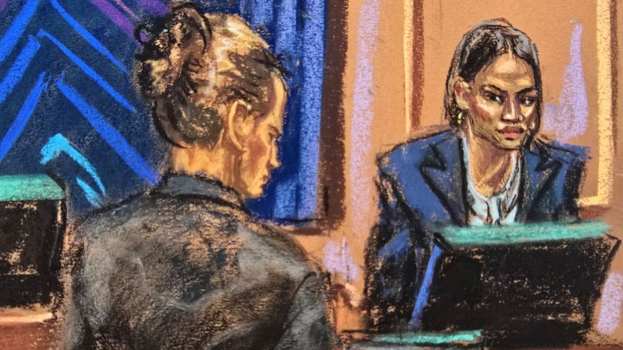 A courtroom sketch shows Casandra “Cassie” Ventura on the witness stand, facing an intense cross-examination.