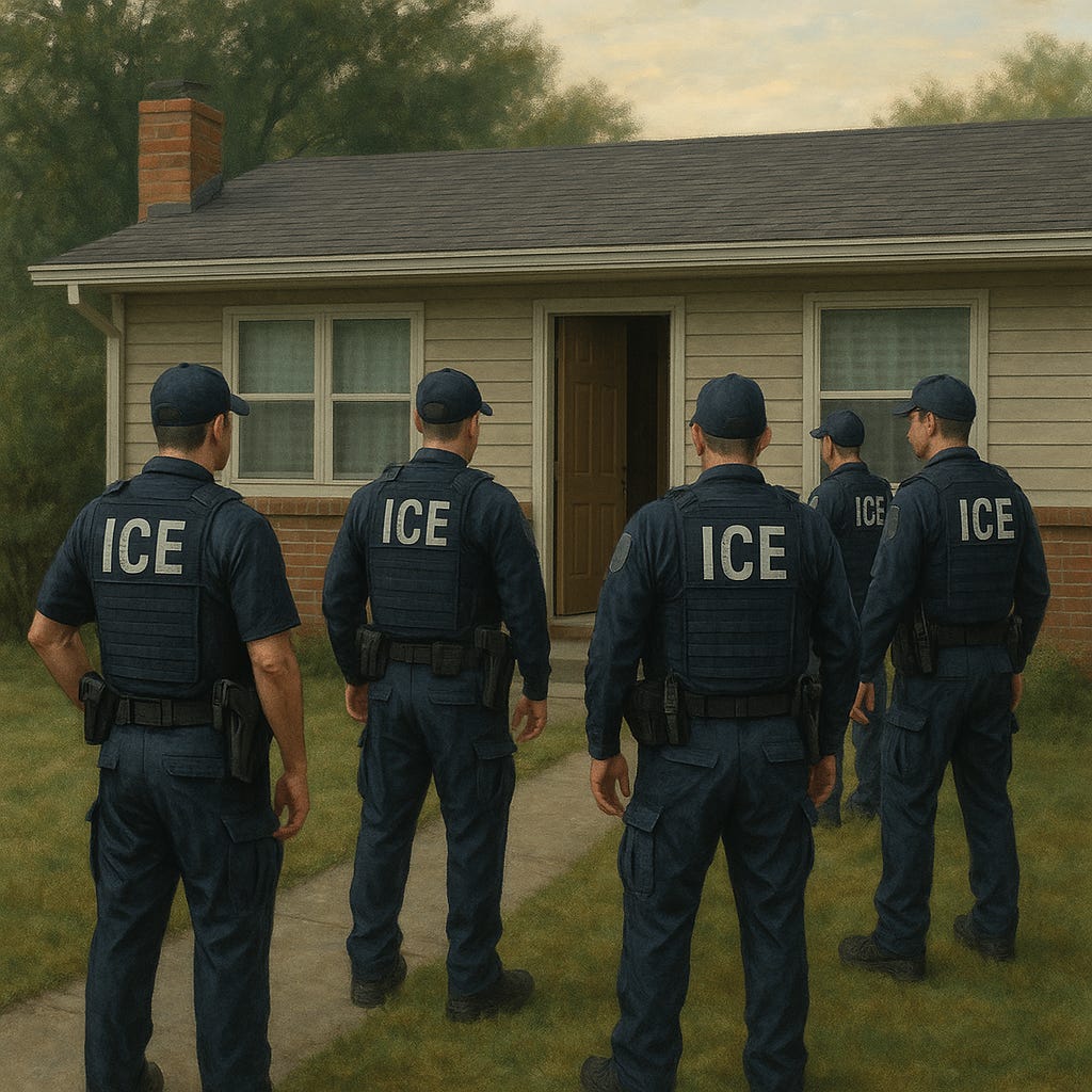 Scene: Early morning. Five ICE Agents are loitering outside a house in Tenessee when the occupant’s immigration lawyer arrives.